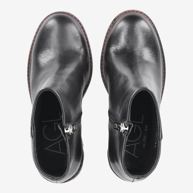 | Merkmale | Reißverschluss, Blockabsatz, Plateausohle vorn 35 mm, Profilrillen in der Sohle, silberfarbener Metallzipper mit AGL Logoprägung, braune Kontrastleiste in edler Holz-Optik, atmungsaktiv, italienische PREMIUM Qualität |