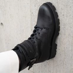 | Merkmale | Plateauabsatz, Extralight Sohle, Einstiegschlaufe, Logoapplikation, Logoprägung, Lederriemen mit Nietenapplikation, über einen Metallverschluss zu schließen, seitlicher Reißverschluss, Schmuckpaspel mit Glitzersteinchen entlang der Saumkanten, Effektschnürsenkel aus gepolstertem Textil, atmungsaktiv |