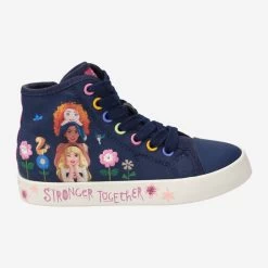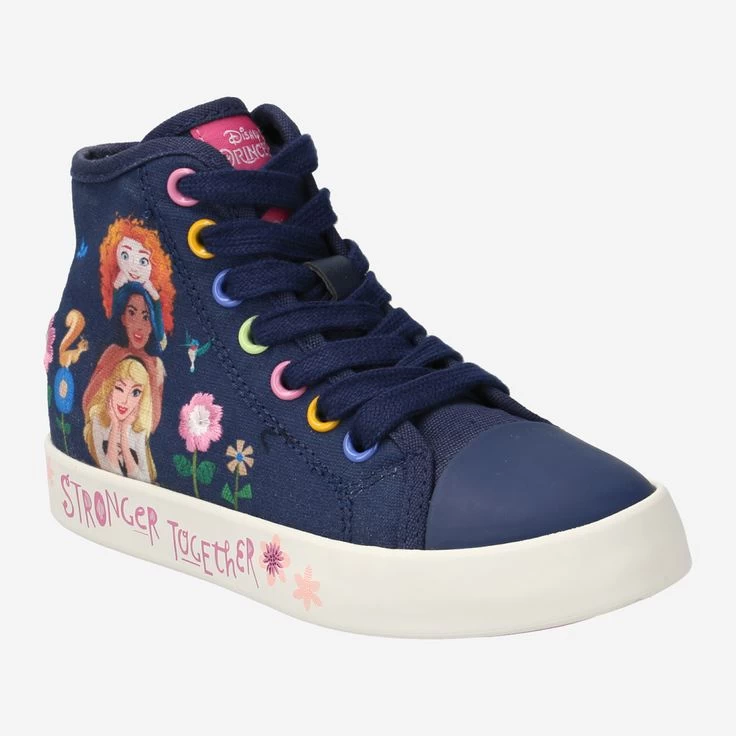 | Merkmale | Wechselfußbett, für Einlagen geeignet, Innensohle aus chromfrei gegerbtem Leder (atmungsaktiv, stoßdämpfend, antibakteriell), Reißverschluss, Logoapplikation / individuell anpassbar, Klettverschluss, Ziernähte, Hightop-Sneaker mit Gummikappe aus der Disney®-Kollektion „Princess“, Motivdruck seitlich mit Pocahontas®, Prinzessinn Aurora/ Dornröschen® und Merida®, 3D Stickerei Blume und Textilapplikation an der Ferse, bunte Ösen, atmungsaktiv |