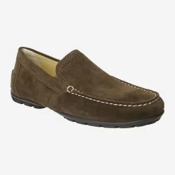 Dunkelbraune Herren-Slipper von Geox. Das Obermaterial besteht aus Nubukleder, das Innenfutter ist mit Leder ausgekleidet. Die Slipper besitzen eine Lederdecksohle sowie eine Gummisohle. Stretcheinsätze erleichtern den Einstieg und Kontrastnähte sowie eine dezente Logoprägung sind zusätzlich eingearbeitet.