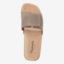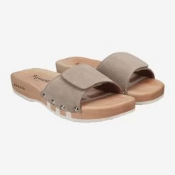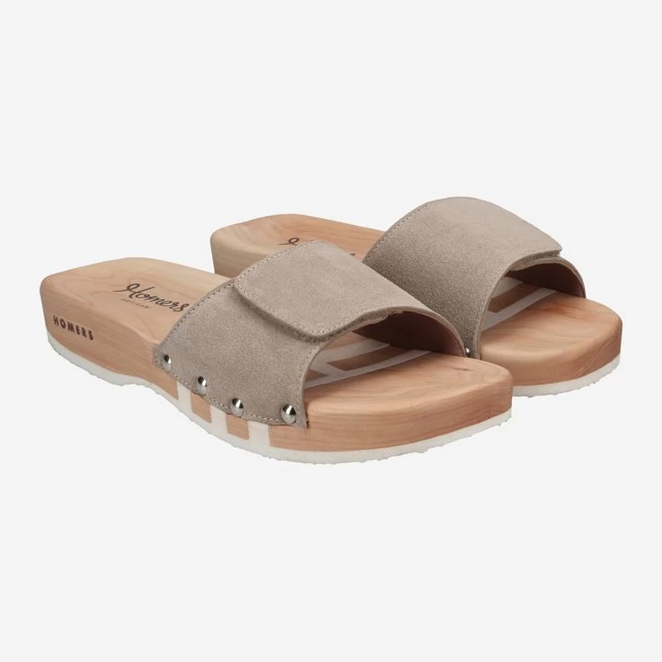 Ursprüngliche Naturmaterialien wie Holz und Leder prägen den Look dieser exklusiven Pantolette von Homers. Das beige Veloursleder ist butterweich, und bietet Ihnen dadurch höchste Flexibilität. Das Holz ist ebenfalls durch seine natürliche Maserung einzigartig, wodurch jeder Stück ein Unikat ist. Homers arbeitet flexible Gummielemente in die Sohle ein, um Ihnen hohen Komfort beim Abrollen zu bieten. Die silberfarbenen Nieten fixieren den Riemen, und unterstreichen den handgearbeiteten Charakter dieser Sommer-Pantolette!
