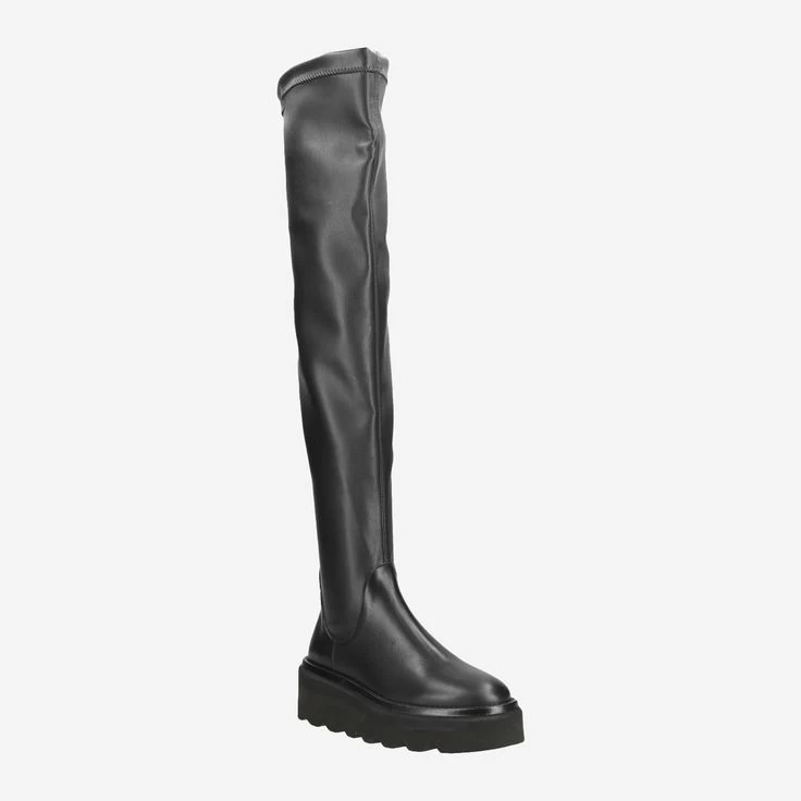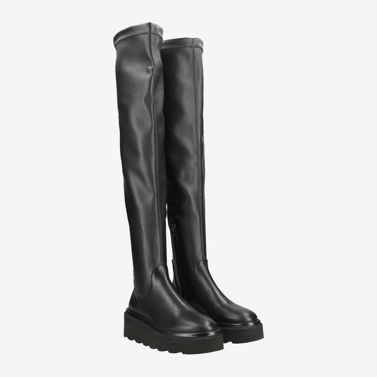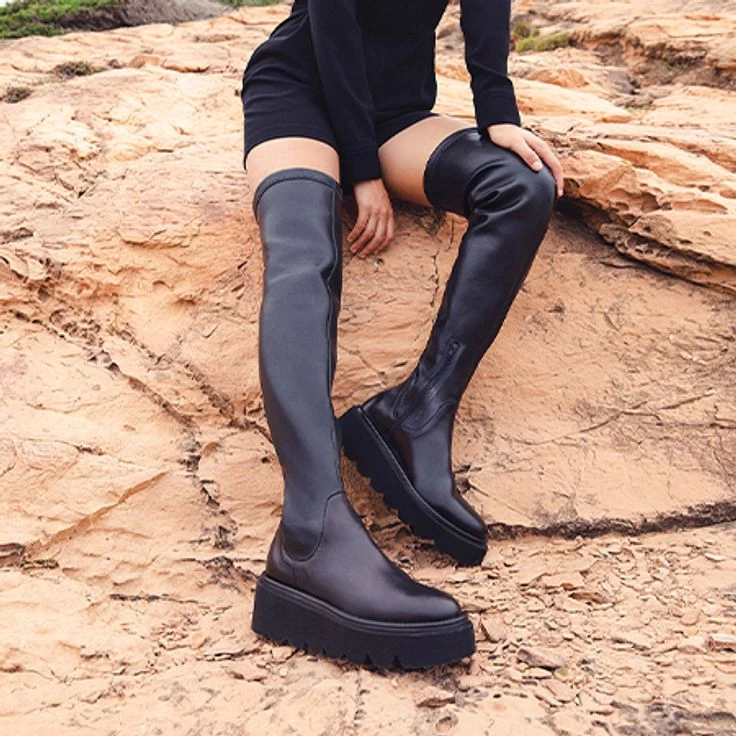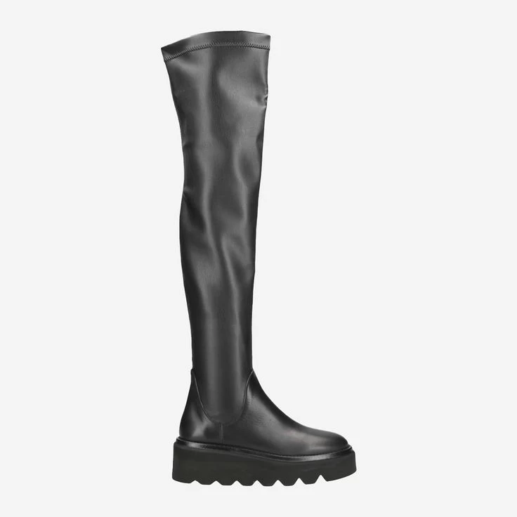 | Merkmale | Overknee-Stiefel, Schaftbereich aus Stretchleder, Reißverschluss, gewellte Plateausohle |