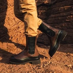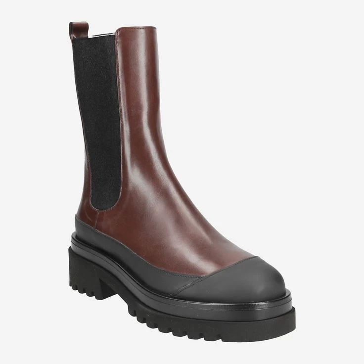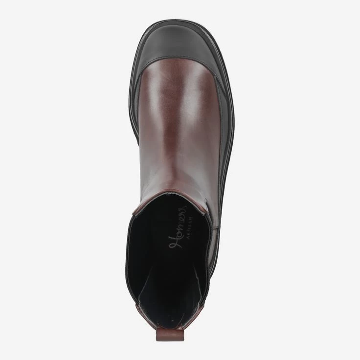 Fashionistas aufgepasst! Die Kombination aus traditionelle gefertigtem, braunem Leder und schwarzen Kontrasten bietet stylingtechnisch höchste Flexibilität für Ihren individuellen Look mit „Golva“. Die verarbeitete schwarze Zehenpartie akzentuiert das außergewöhnliche Design dieses Chelsea-Boots von Homers.