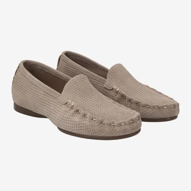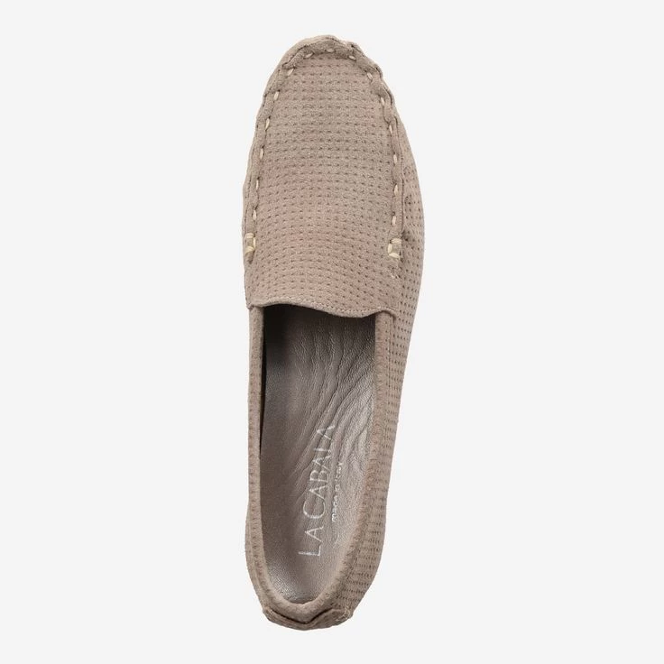 Genießen Sie exklusiven Komfort mit diesem italienischen Slipper von La Cabala! Das beige Veloursleder überzeugt durch die gleichmäßig gelochte Struktur. Das Design ist klassisch, die groben Kontrastnähte unterstreichen den individuellen Look dieses handgearbeiteten, italienischen Designerschuhs.