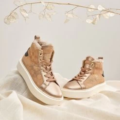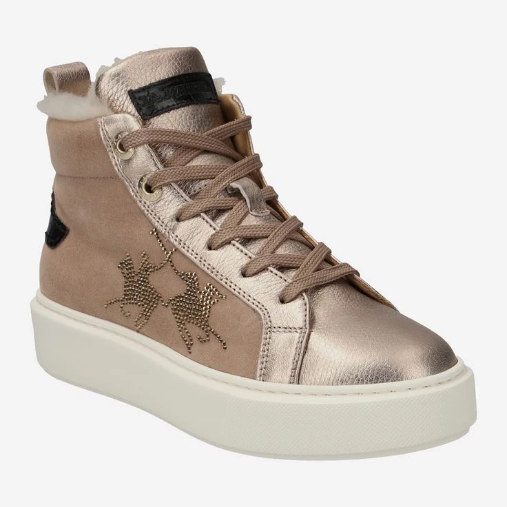 Die italienische Luxus-Manufaktur La Martina steht für außergewöhnliche Exklusivität und handgearbeitete, traditionelle Machart. Einst stattete La Martina die Universitäts-Teams Harvard, Yale und Oxford aus, inzwischen kommen alle in den Genuss dieses Kunsthandwerks! Dieser beige-goldfarbene High-Sneaker überzeugt durch sein kuscheliges Warmfutter aus 100% Schaffell, das Ihnen auch an kalten Tagen den lässigen Sneaker-Look ermöglicht. Zahlreiche Details runden diesen Schnürschuh edel und exquisit ab.