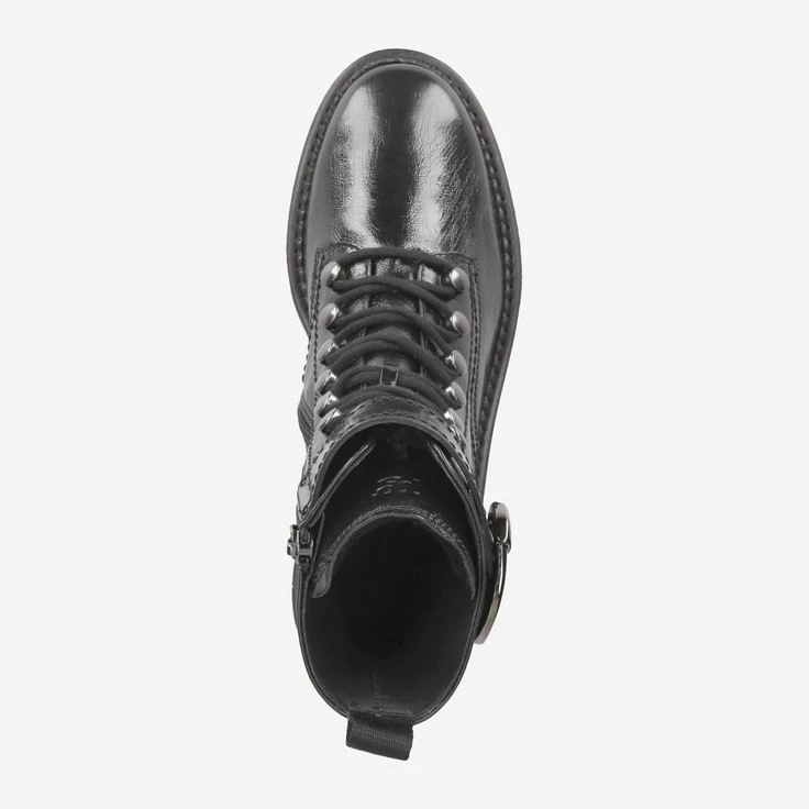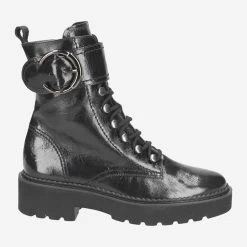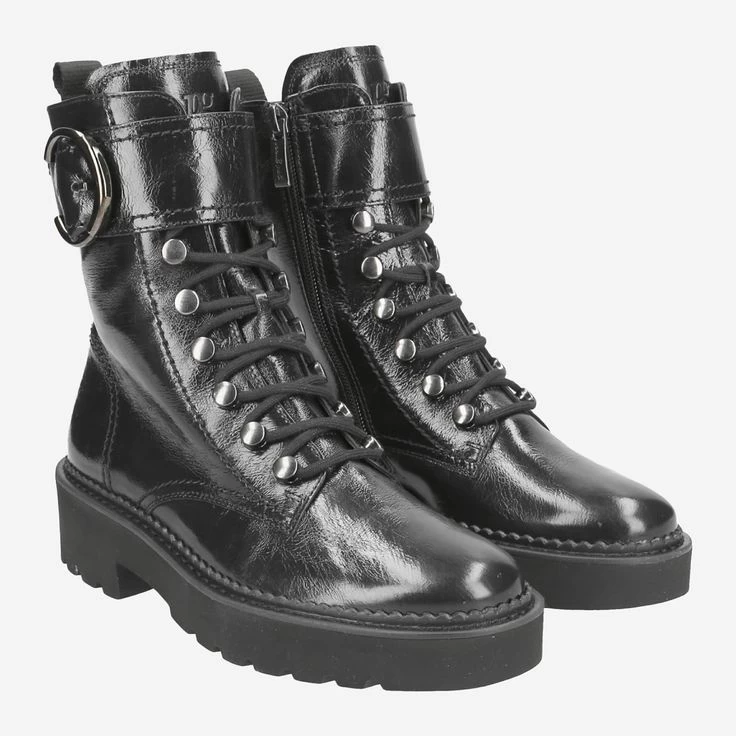 | Merkmale | Reißverschluss, Dekoverschluss mit Metallschnalle, Ösenapplikationen, Logoprägungen, Einstiegschlaufe, Blockabsatz, Sohlenhöhe vorn: 25 mm, flexibler, anpassungsfähiger Knautschlack |