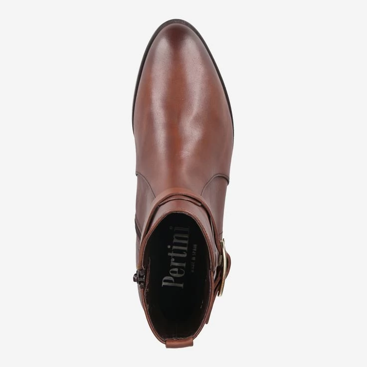 Pertini präsentiert Ihnen diese handgearbeitete Stiefelette, die viel Liebe zur Eleganz mitbringt, durch exklusive Verarbeitung punktet, und einen Hauch Glamour transportiert. Das cognac-braune Glattleder schimmert edel, und ist durch einen Lederriemen mit goldfarbener Metallschnalle abgerundet.