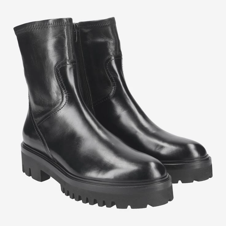 Die edlen Stiefeletten von Trumans aus schwarzem Glattleder und elastischem Stretchnappa überzeugen durch ihr schlichtes Design und hohen Tragekomfort. Sowohl die Decksohle als auch die Innensohle wurde aus Leder gefertigt – beide garantieren perfekten Komfort. Den Einstig erleichtert ein Reißverschluss, der ebenfalls am Schaft angebracht wurde. Der etwa 40mm hohe Absatz sorgt zusammen mit der leichten Gummisohle für einen festen Stand auf jedem Untergrund.